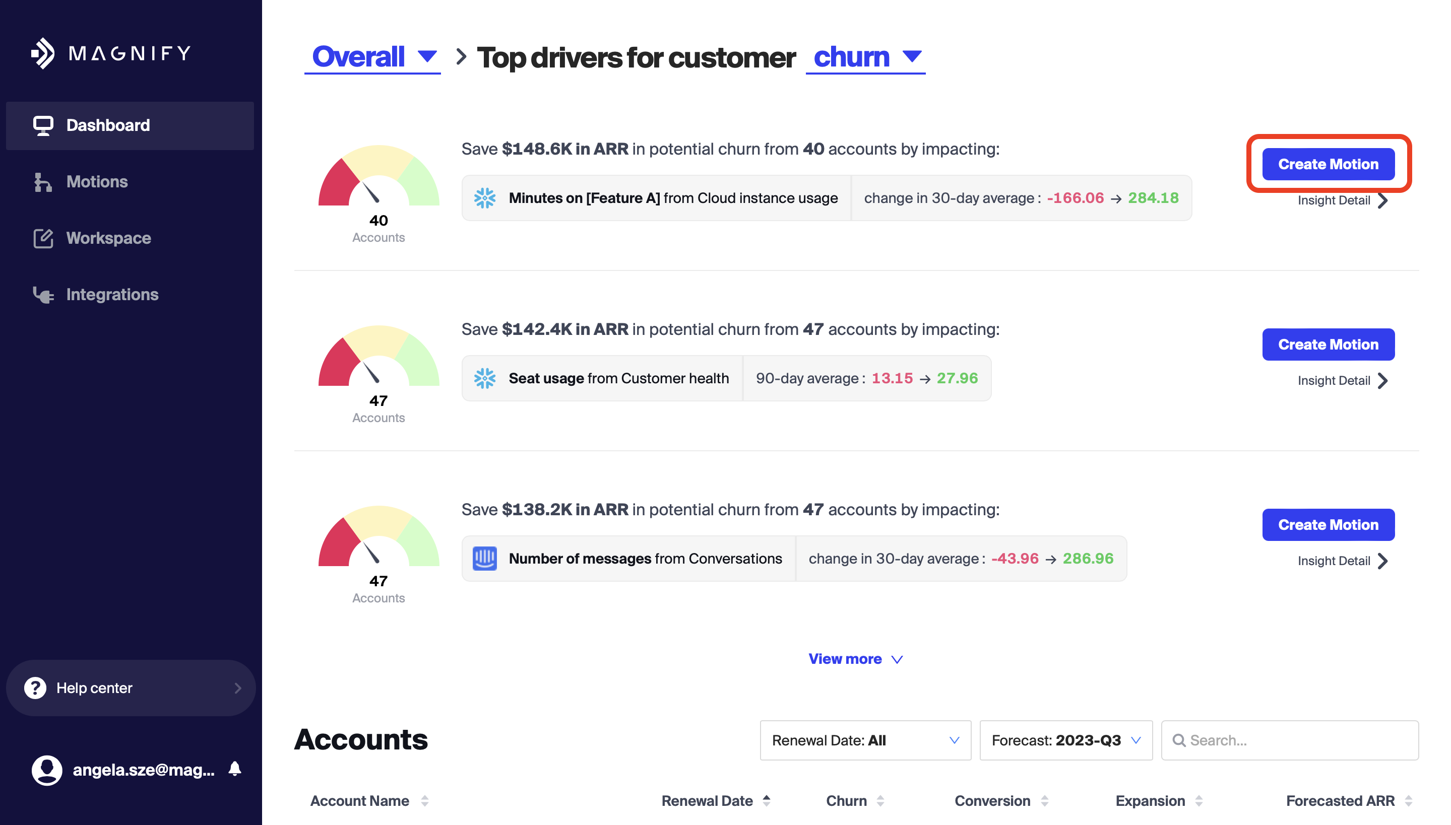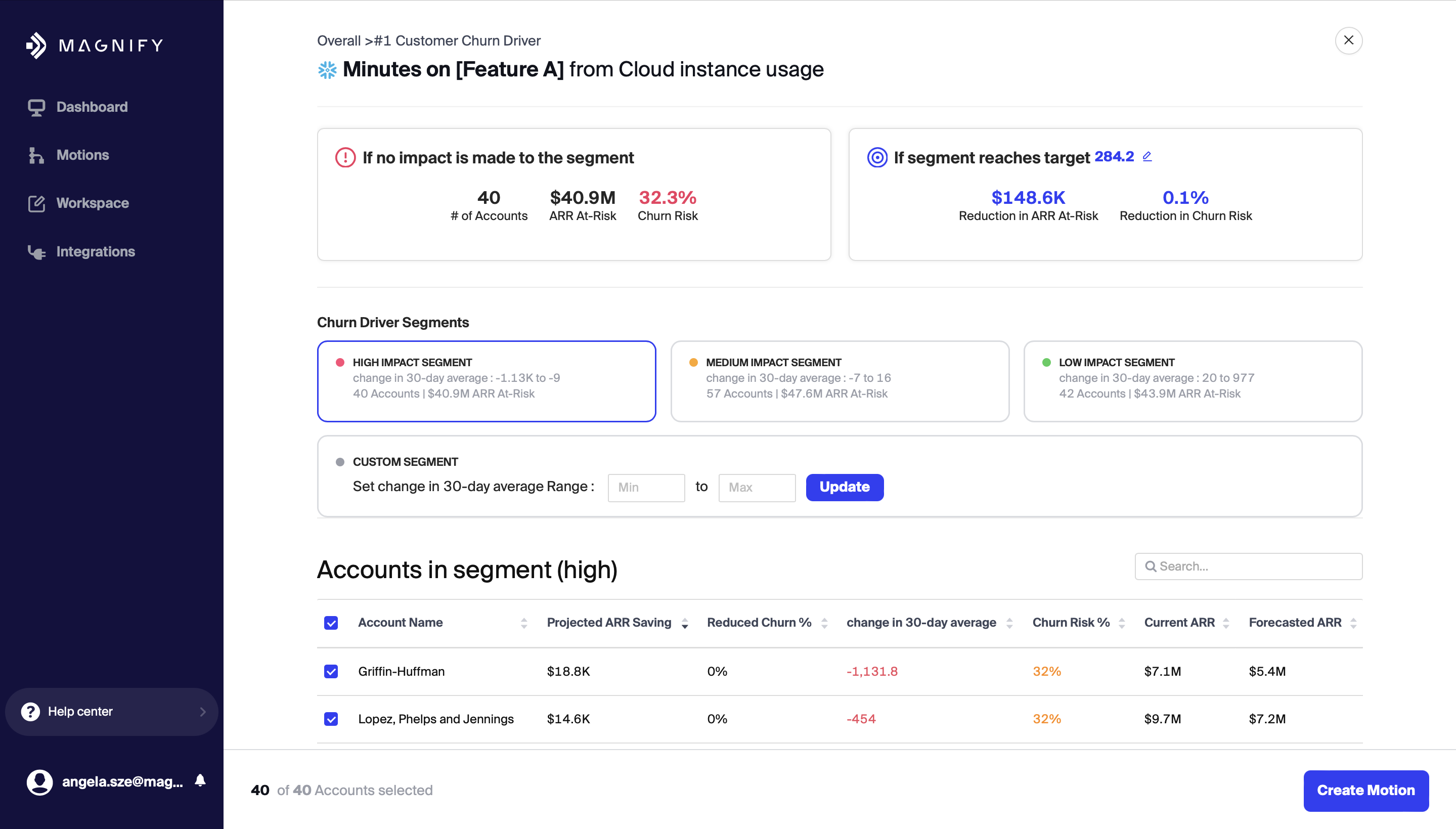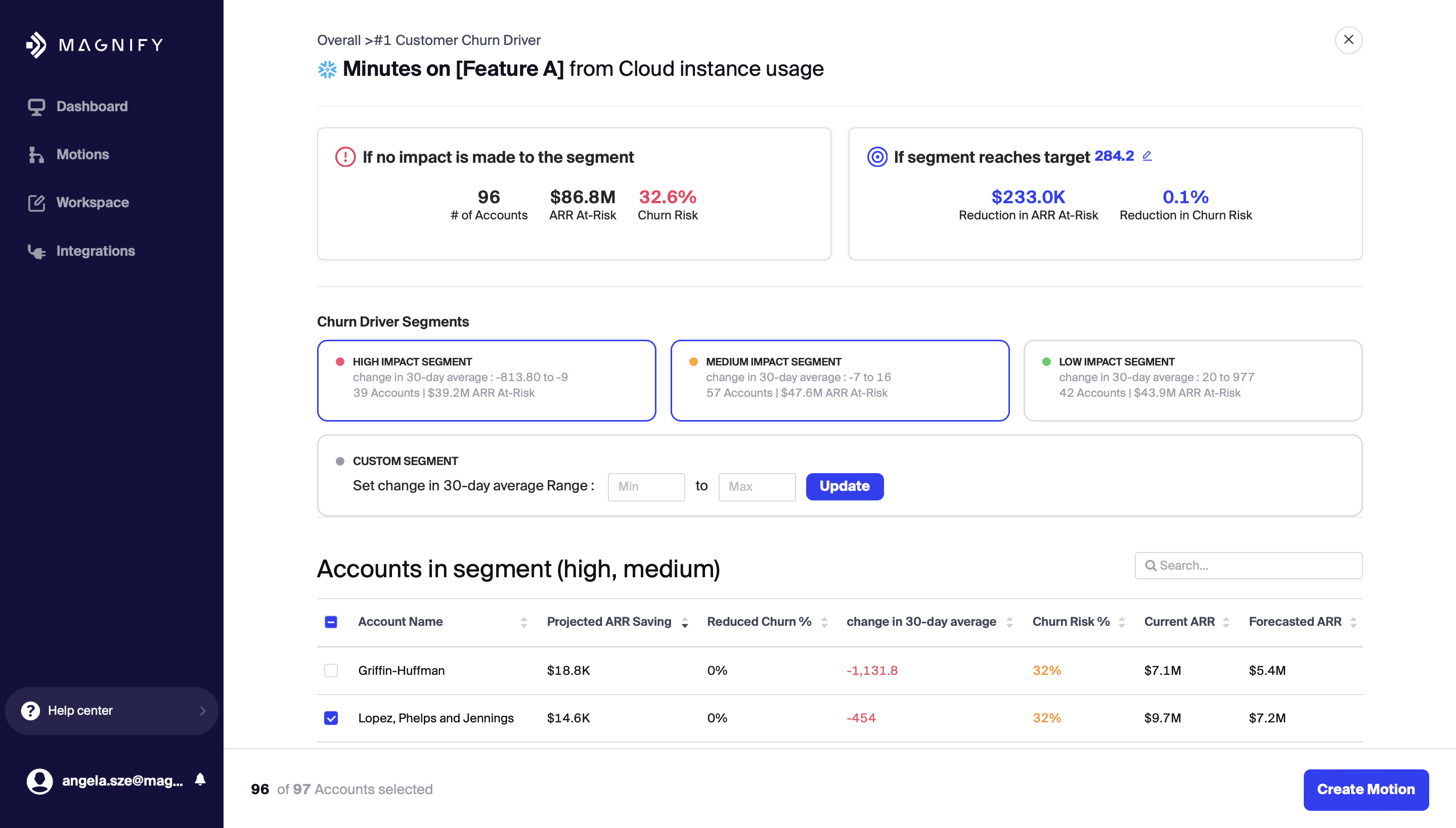 When drilling into a specific driver you have the option to select multiple segments or specify a custom segment. With a segment selected or defined you can easily create a motion with the segment criteria already populated, by clicking the Create Motion button at the bottom of the page.