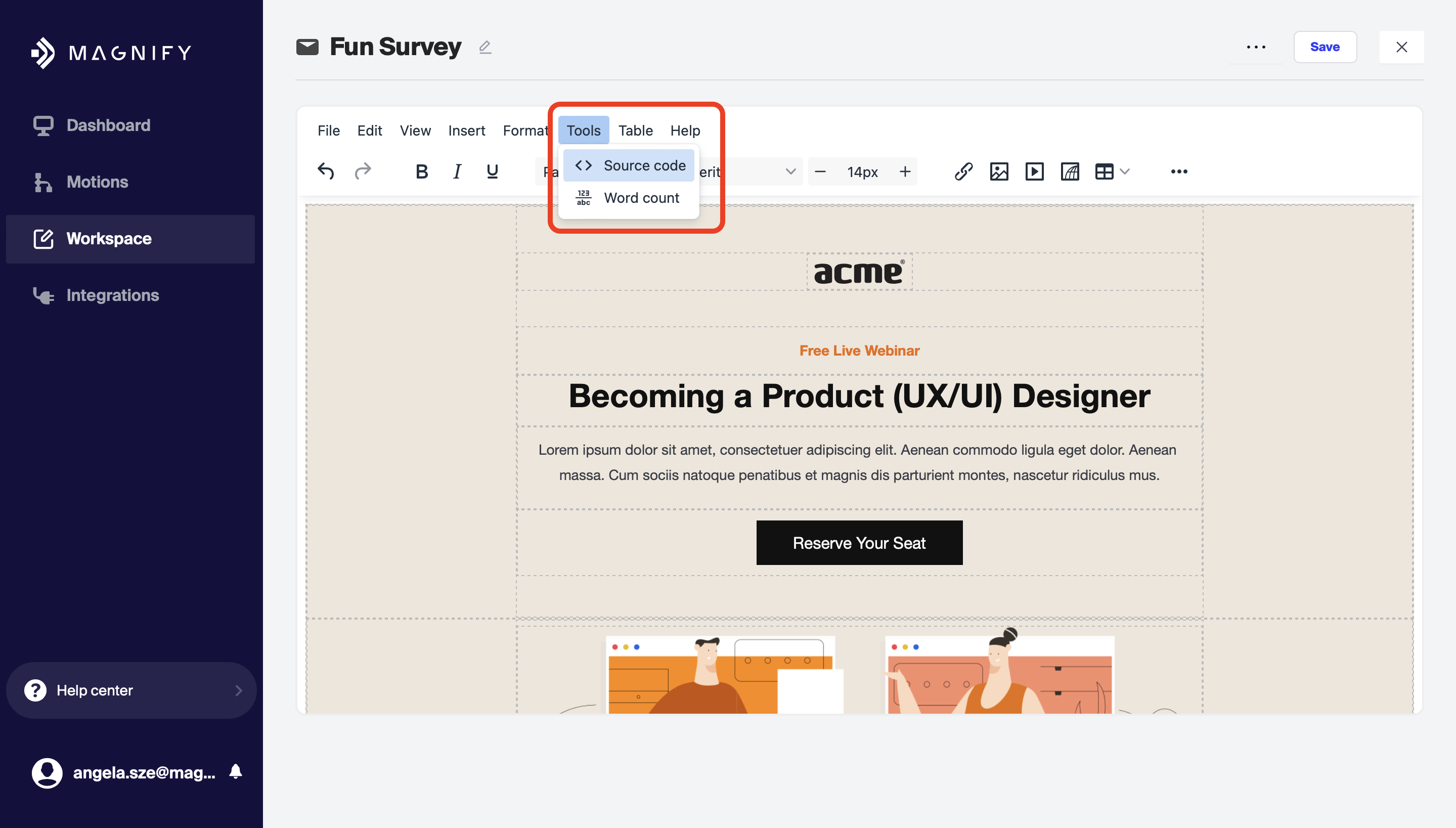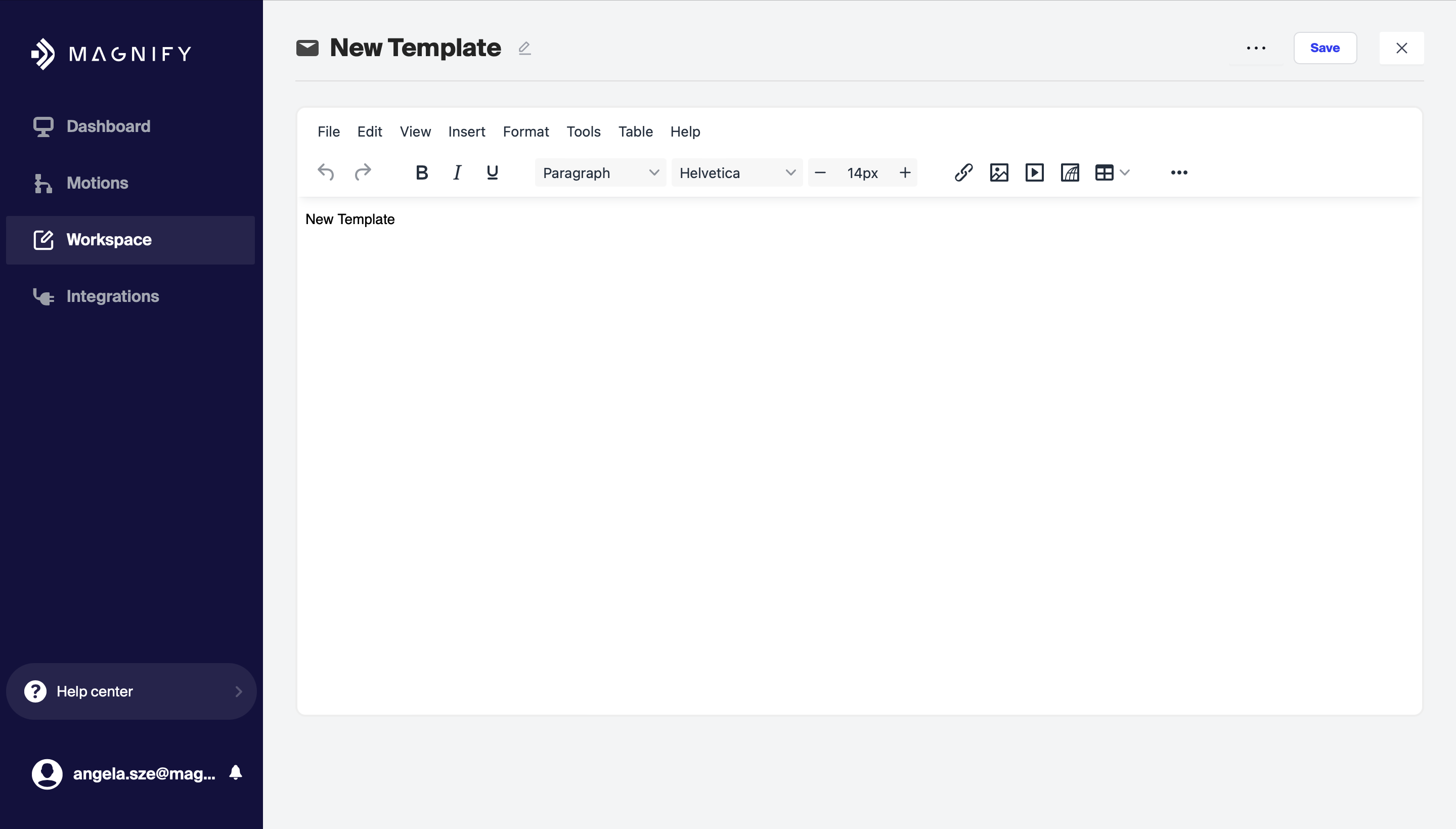 From the Workspace, select the + Create New to create a new email template. Doing so will drop you into a text editor where you can create the content of your email.